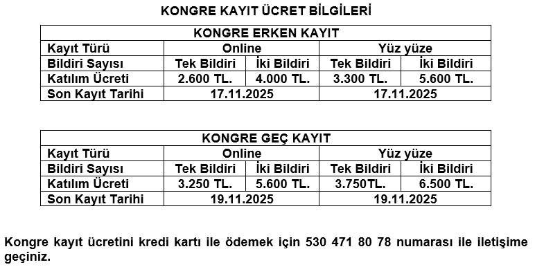 Katılım ücretine; Özet ve Tam Metinlerin ISBN'li E-Bildiri Kitapçığında Yayınlama ücreti dahildir.